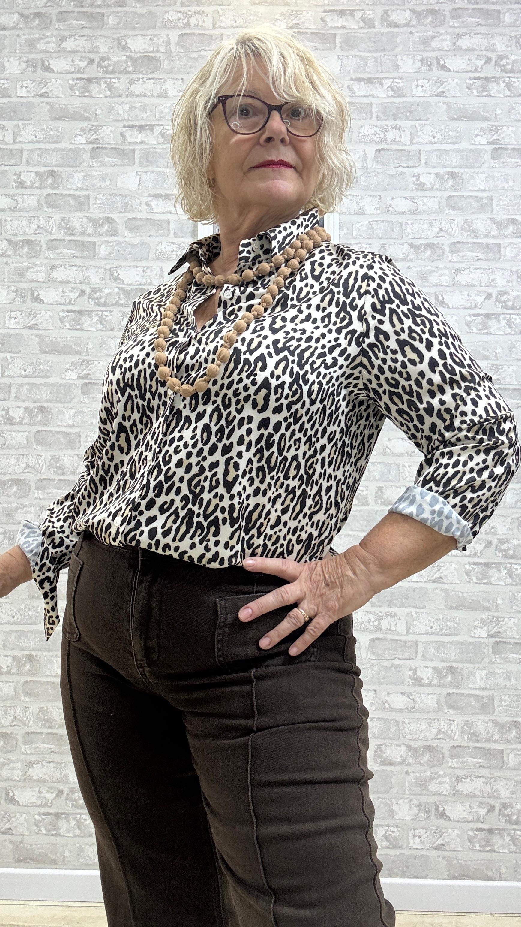Camisa de Raguassa estampado en leopardo con colores beiges y negros, tacto seda 100% poliéster.