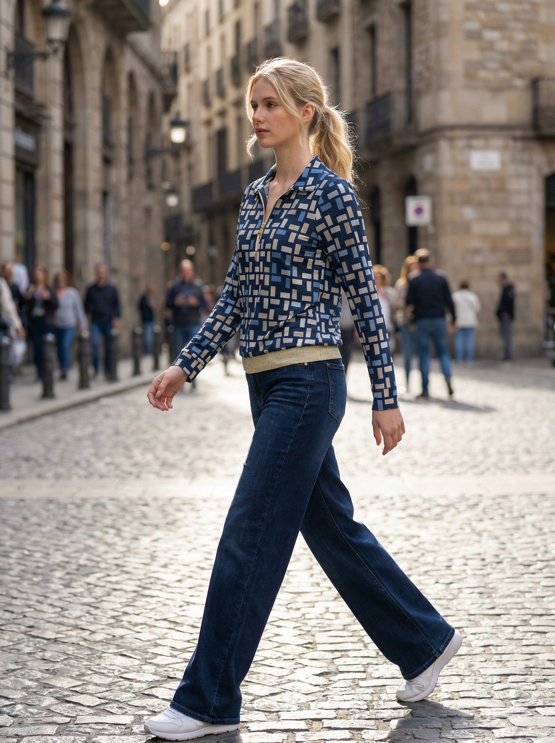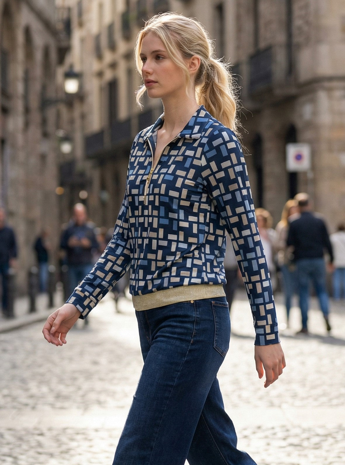 Camiseta Alvin Solo de manga larga con estampado geométrico en tonos azul y blanco, ideal para un look moderno y fácil de combinar. Su cuello camisero con cremallera aporta un toque actual, mientras que el bajo elástico ofrece un ajuste cómodo y favorecedor. Perfecta para el día a día con pantalones, vaqueros o faldas.