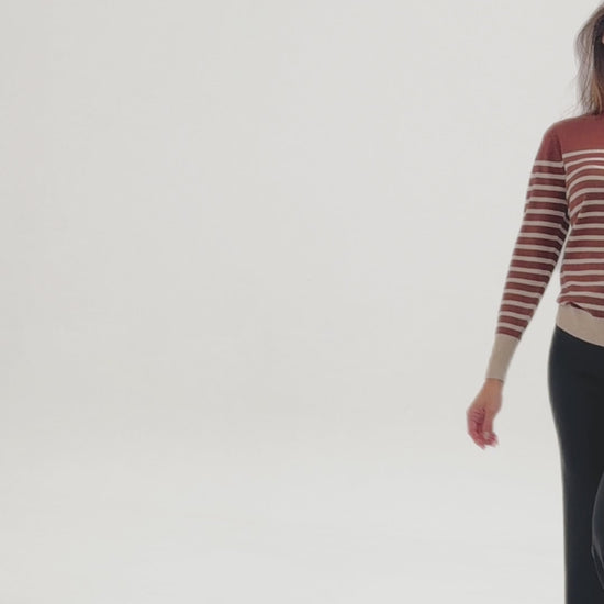 Chaqueta en punto de Huso cierre de botones con rayas en marrón y beige. Goma en el punto con 3 botones. Tallas 42 a 50