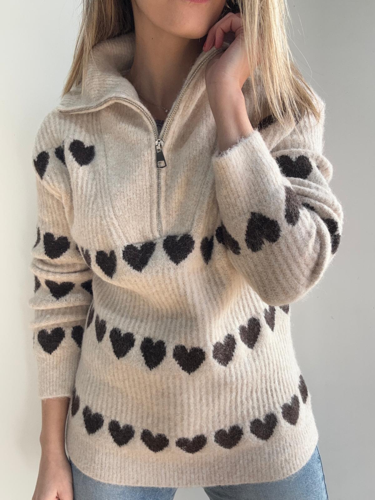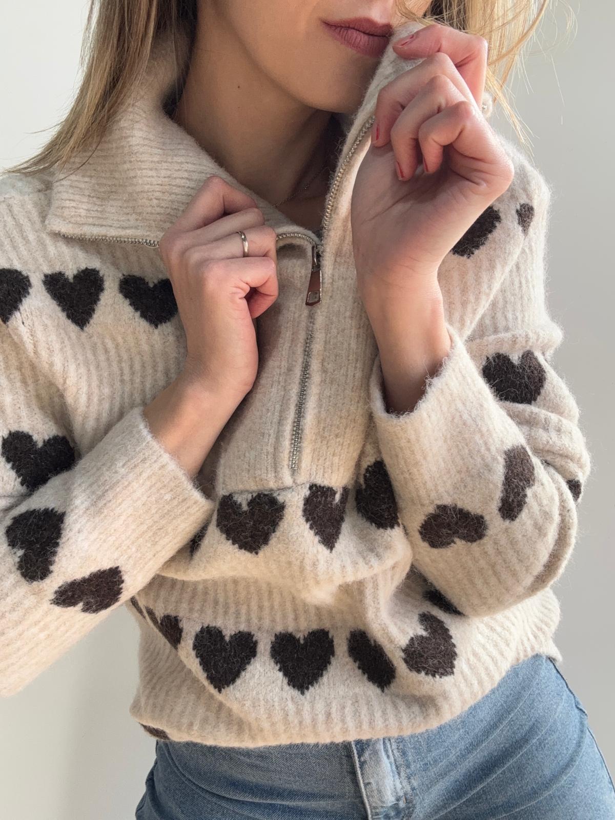 Suéter de punto fondo color taupe y corazones choco con cuello camisero y cremallera.