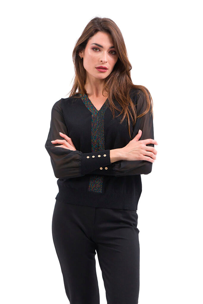 Suéter en punto de Huso con mangas de gasa y franja central brillante ideal para comidas, cenas o eventos especiales.